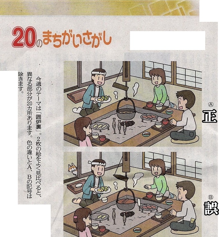 土曜日は、【20の間違い探し(囲炉裏)】と、【漢字クイズ】です。