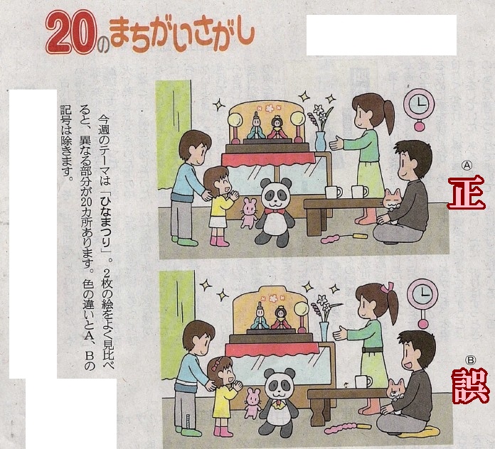 土曜日は、【20の間違い探し(ひな祭り)】と、【漢字クイズ】です。