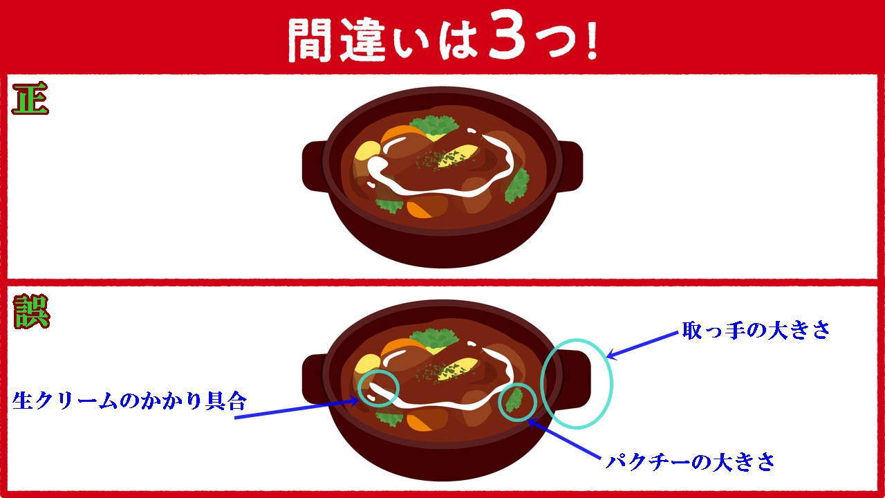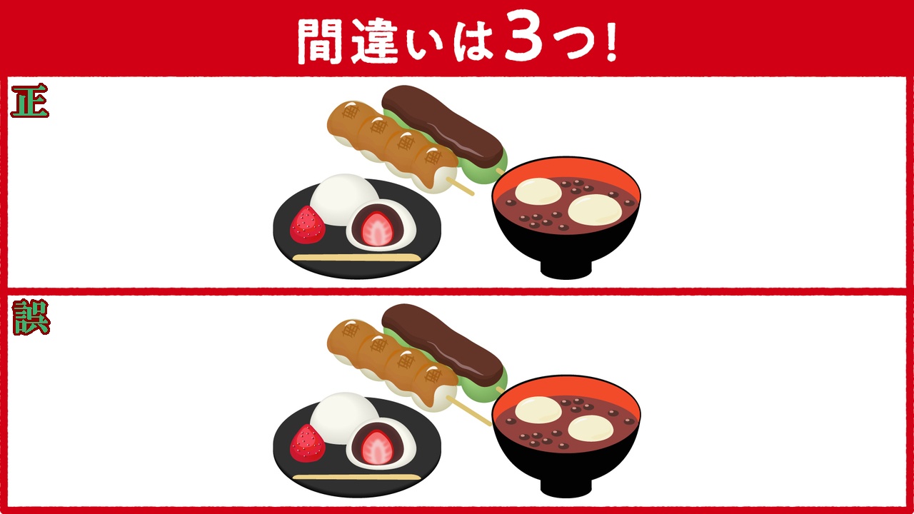 今日の【イラストクイズ】は、(和スイーツの間違い探し)と、【漢字クイズ】です。