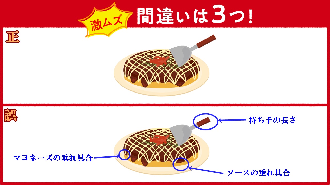 【イラストクイズ】(お好み焼きの間違い探し)も、【20の間違い探し】も、二問共お見事正解でした。オメレトー🎵