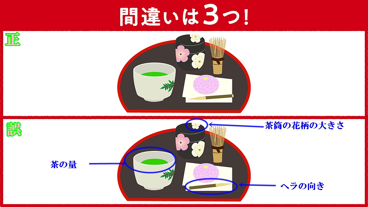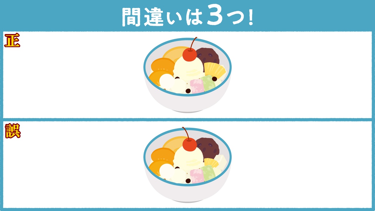 今日は、【イラストクイズ】(あんみつの間違い探し)と、【漢字クイズ】です。