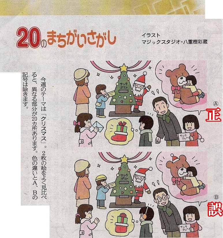 土曜日は、【20の間違い探し(クリスマス)】と、【漢字クイズ】です。