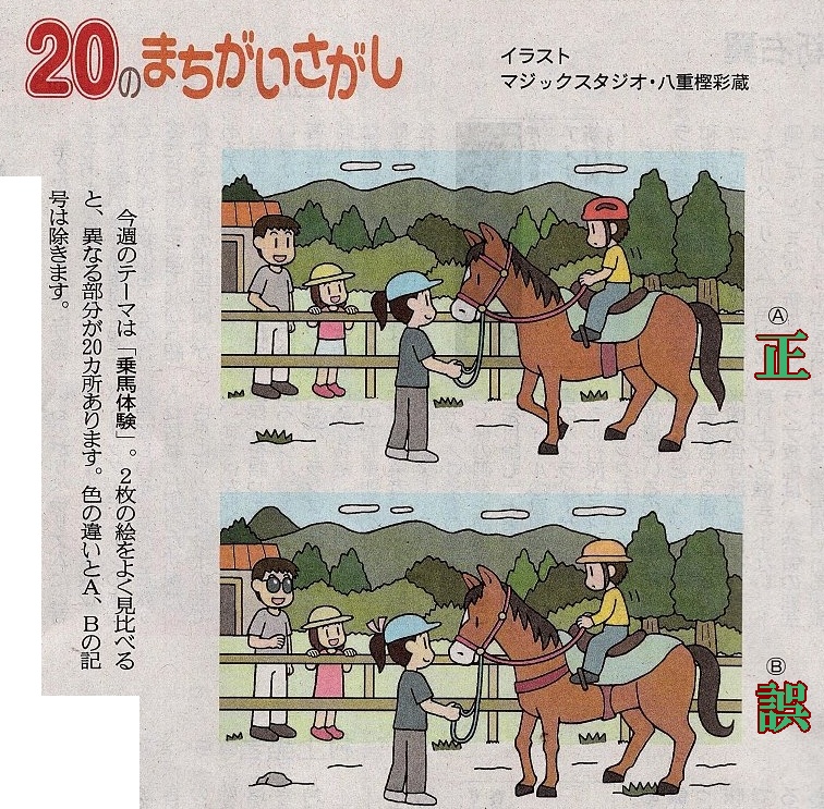 土曜日は、【20の間違い探し】(乗馬体験)と、【漢字クイズ】です。