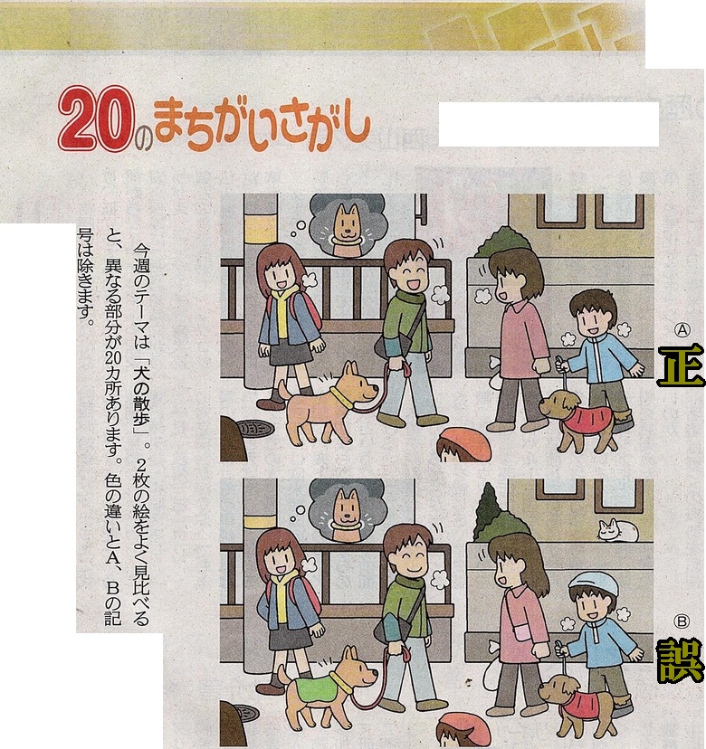 土曜日は、【20の間違い探し(犬の散歩)】と、【漢字クイズ】です。