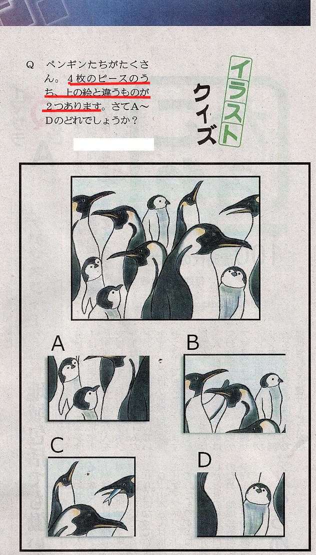私からは、【イラストクイズ(ペンギンの間違い探し)】と、【漢字クイズ】です。