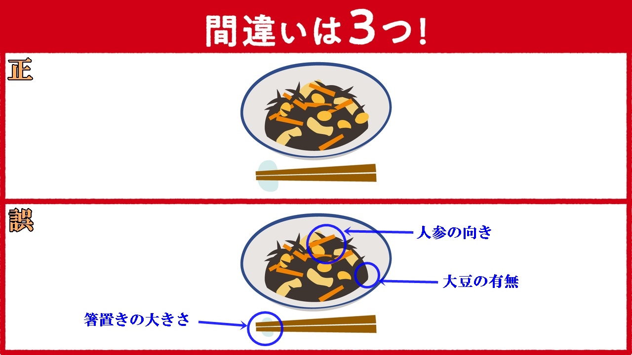 【イラストクイズ(ひじきの煮もの の間違い探し)】も、【漢字クイズ】もお見事正解でーす♪