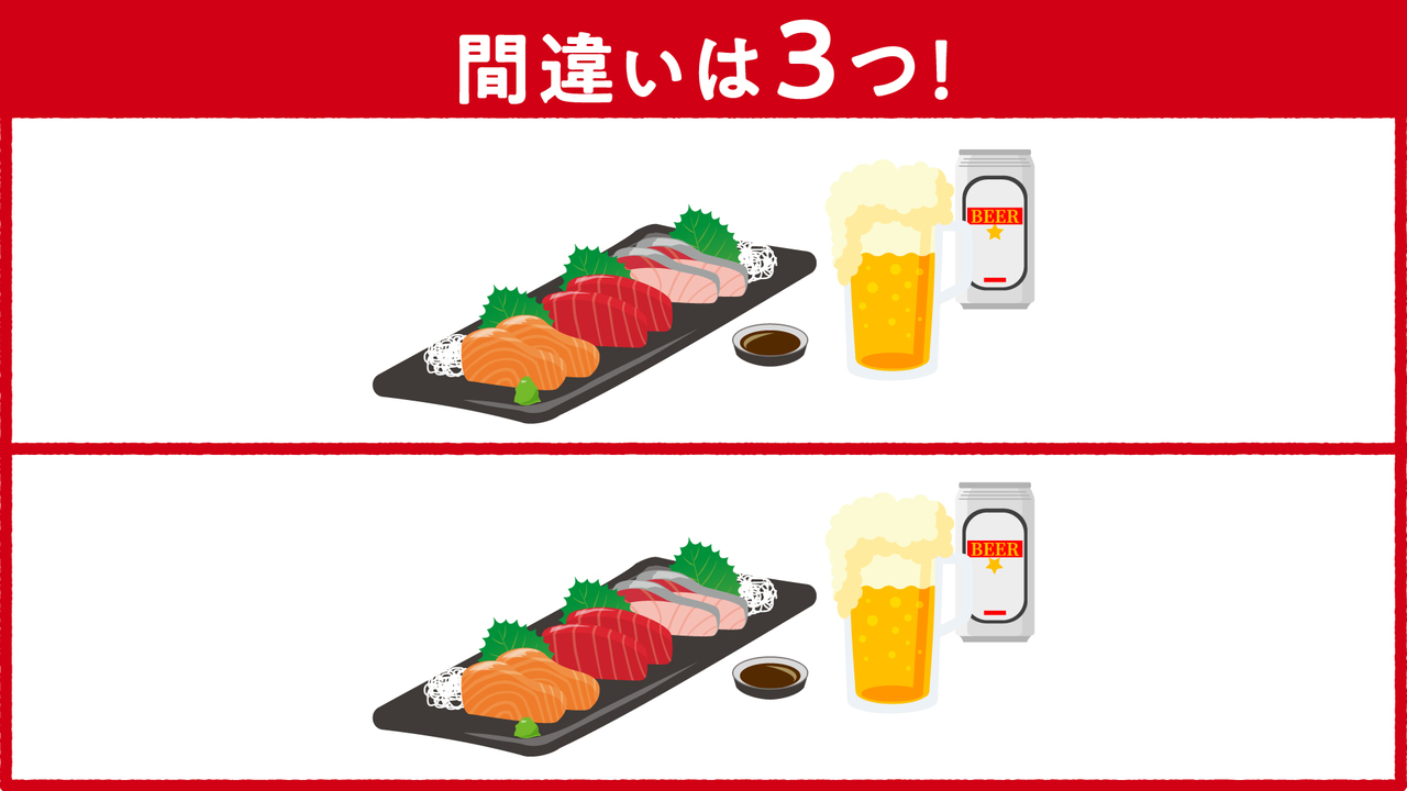 今日の【イラストクイズ】は、(お刺身の間違い探し)と、【漢字クイズ】です。
