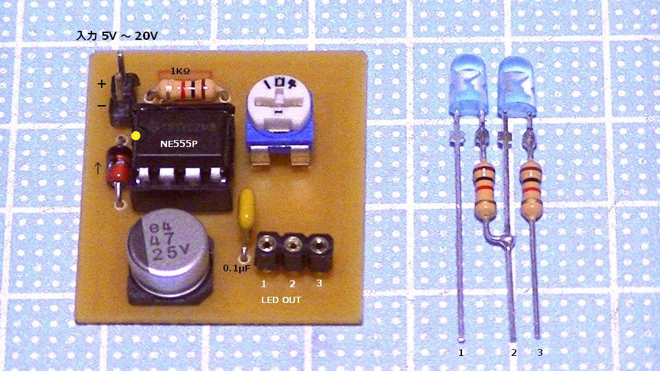 タイマーIC555を使ったLED点滅回路です。 電源用乾電池・電池ホルダー:配線は、別途ご用意してください。 自動車用には、配線のご用意をお願いします。 パーツ一式 -------------------------------------------- さぁ、作ってみましょう。 回路製作の手順は、背の低い部品から順番に取り付けていきます。 最初は、抵抗と逆電圧防止用のダイオードを取り付けます。 コンデンサー2種類を取り付けます。 ICマウントの取り付けです。 最後にVR(可変抵抗)と端子を取り付けます。 ハンダ付けはランド(部品の接続位置)にしっかりとハンダ付けしてください。 最後にICの取り付けです。 --------------------------------------------- LEDの足に抵抗を取り付けます。 LEDの長い方の足を1cmほど残してカットします。 カットしたそれぞれの足をハンダ付けします。 LEDの光る部分の内部の金属の形状も覚えて置きましょう。 LEDを画像のようにソケットへ差し込んで電源をつなげば光り点滅を始めます。 LEDを交互点滅させるには、上の画像のようなLEDを作ります。 ソケットの1番が−端子・3番が+端子です。 1番と2番が消えるときは、2番が−になっているときで、−と−で入力0Vです。 2番と3番が消えるときは、2番が+になっているときで、+と+で入力0Vですね。